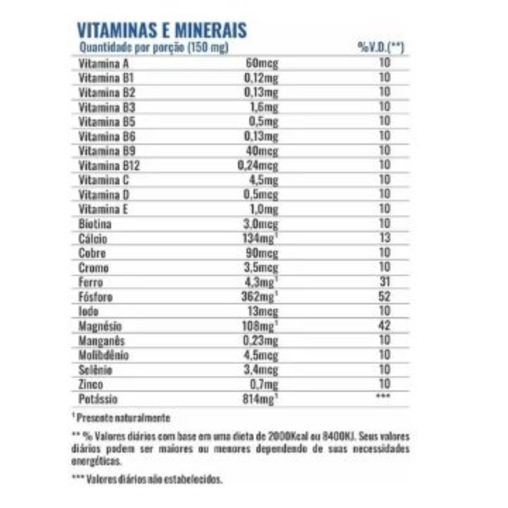 ** % Valores diários com base em uma dieta de 2000kcal ou 8400kJ. Seus valores diários podem ser maiores ou menores dependendo de suas necessidades energéticas.
