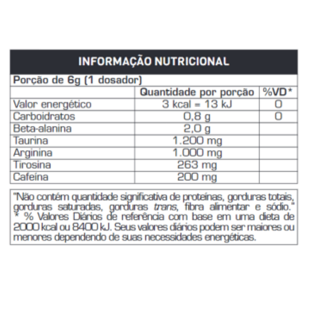 Sua formulação é concentrada e é fonte dos aminoácidos beta-alanina, taurina, arginina e tirosina, associados à cafeína, que atuam em sinergia para auxiliar ainda mais seu desempenho.