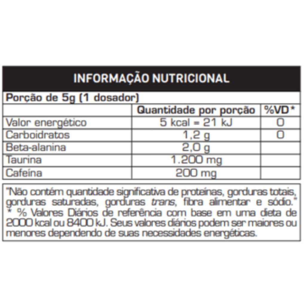 Beta-alanina, taurina, isomaltulose, cafeína, aromatizantes, acidulante ácido cítrico, regulador de acidez ácido málico, edulcorante sucralose, antiumectante dióxido de silício e corantes artificiais amaranto e azul brilhante fcf.