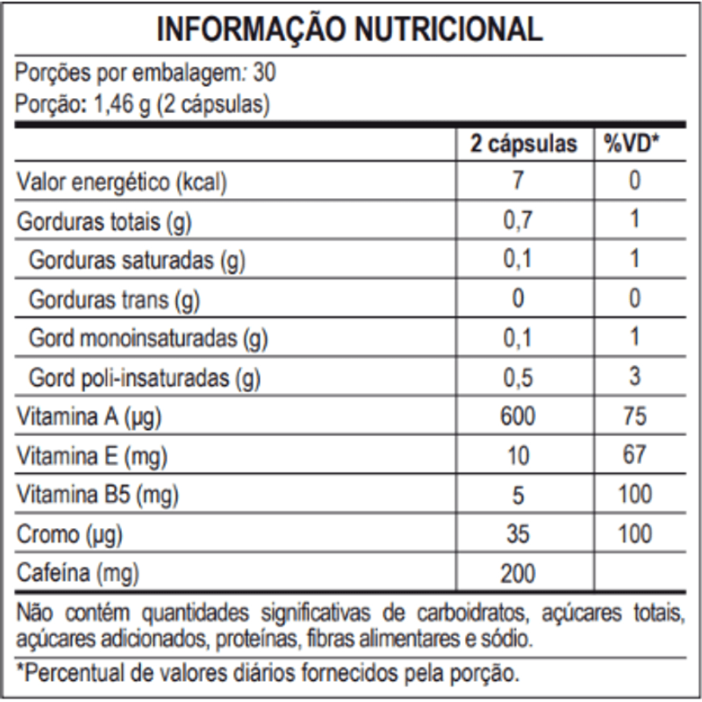 Ingredientes | Óleo de cártamo, gelatina, cafeína, óleo de semente de uva, óleo de girassol, água purificada, acetato de DL-alfa tocoferol, D-pantotenato de cálcio, palmitato de retinol, picolinato de cromo, umectante glicerina, emulsificante lecitina de girassol, estabilizante cera de abelha e corantes dióxido de titânio e azul brilhante. CONTÉM GLÚTEN. |