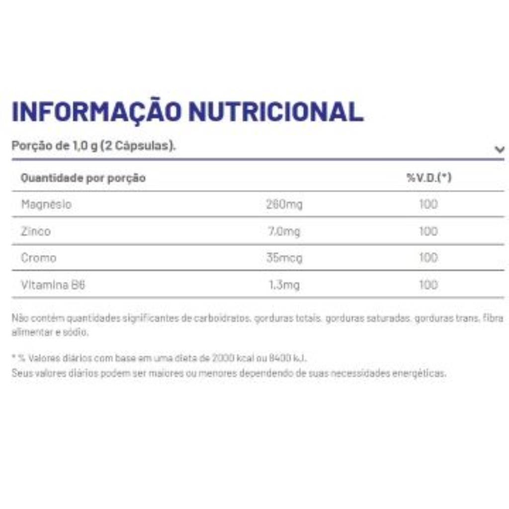 Bisglicinato de magnésio, maltodextrina, bisglicinato de zinco, picolinato de cromo, piridoxina (vitamina B6) e cápsula (gelatina, corantes azul brilhante, azorrubina e dióxido de titânio). NÃO CONTÉM GLÚTEN.